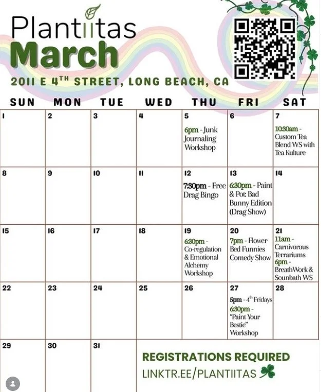 Plantiitas Sunday, March 1, 2026 4:30 PM Tuesday, March 31, 2026 5:30 PM 2011 East 4th Street Long Beach, CA, 90814 United States (map) Google Calendar ICS